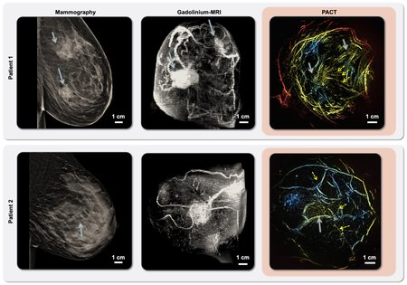 Images of the same breast in two patients with invasive ductal carcinoma, shown from mammography (left), contrast-enhanced magnetic resonance imaging (MRI, middle), and non-invasive photoacoustic computed tomography (PACT, right). PACT is less affected by breast density than mammography and reveals more feeding vessels than MRI, as indicated by dashed arrows.